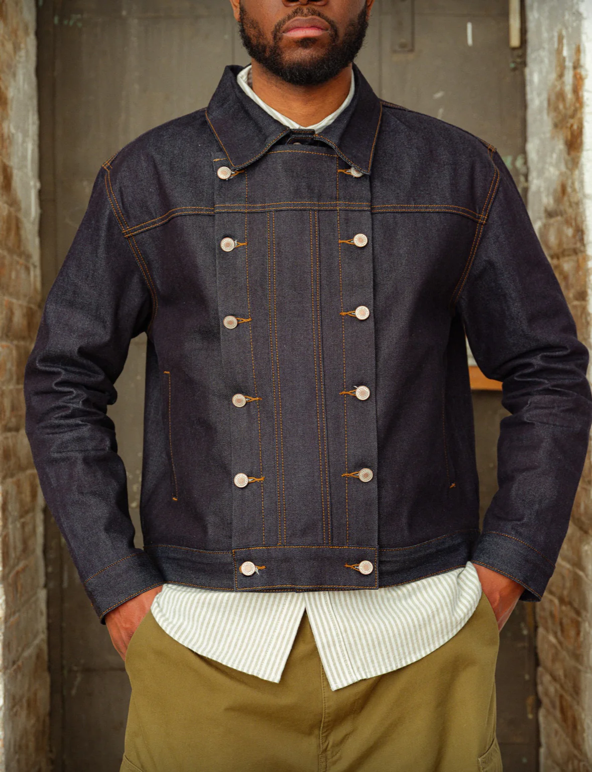 Designed for a modern sophisticated look. The Double Breasted Denim jacket features premium selvedge denim, creating overtime a unique patina specific to the wearer.